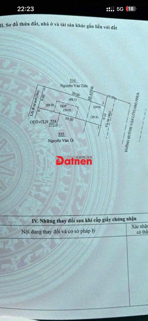 DT 9x29m CN 272m² ODT 50m², 2 mặt tiền.