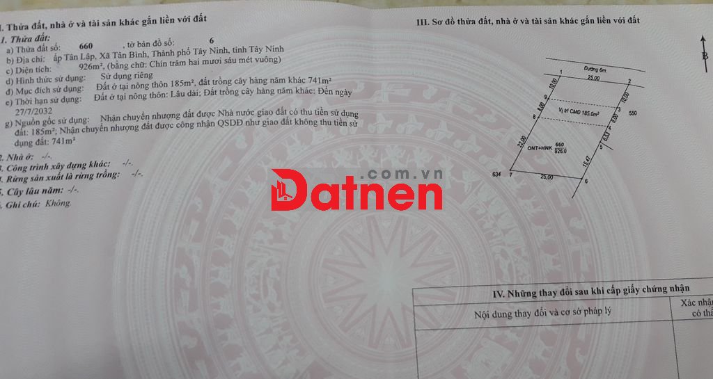- Diện tích: 25 x 40 (đã có sẵn 185m2 đất ở đô thị)