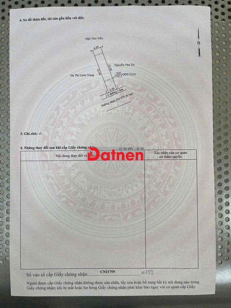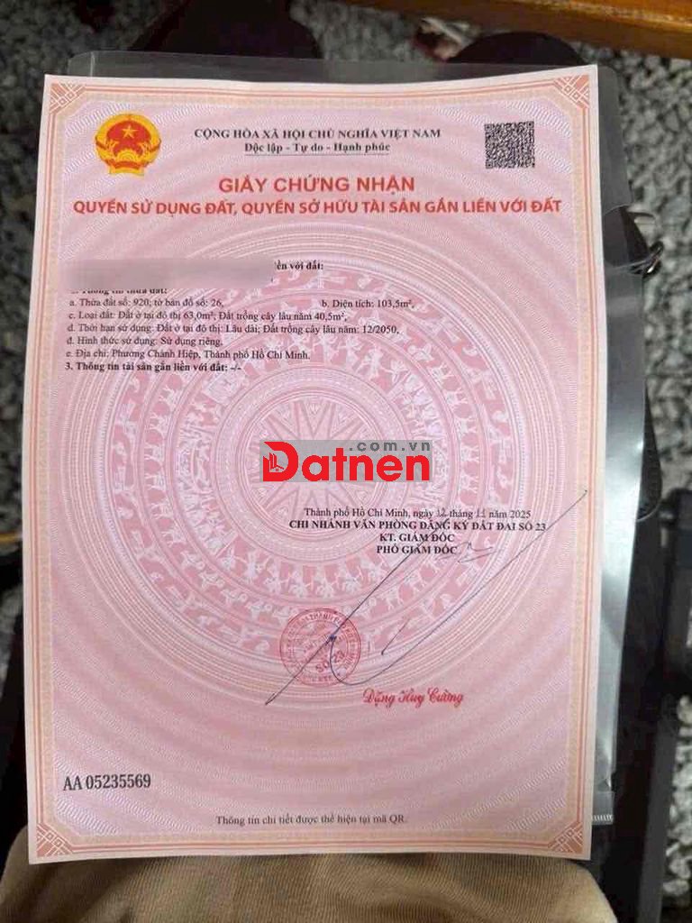 - Diện tích: 4,5 x 23 có 63m2 thổ cư