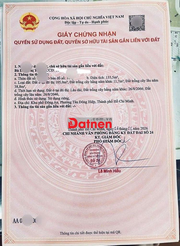 Thổ cư 105m2. Sổ hồng riêng.