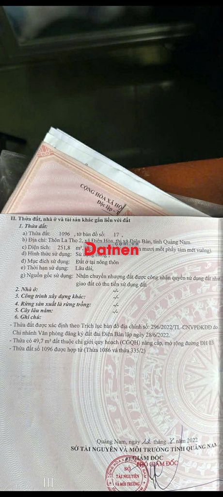 Quý vị đang xem nội dung tin rao "Lô đất mặt tiền đường nhựa 251M², Đường DH3, Điện Bàn Bắc, TP Đà Nẵng". Mọi thông tin, nội dung liên quan tới tin rao này là do người đăng tin đăng tải và chịu trách nhiệm. Datnet.com.vn luôn cố gắng để các thông tin được hữu ích nhất cho quý vị tuy nhiên Datnet.com.vn không đảm bảo và không chịu trách nhiệm về bất kỳ thông tin, nội dung nào liên quan tới tin rao này.