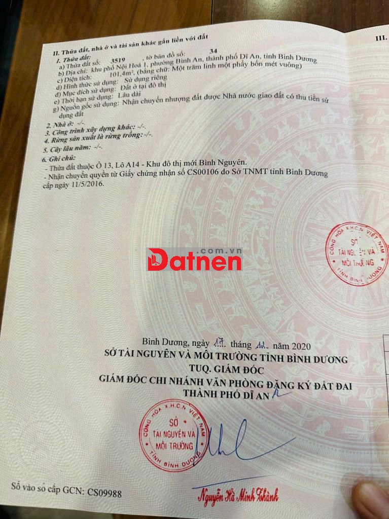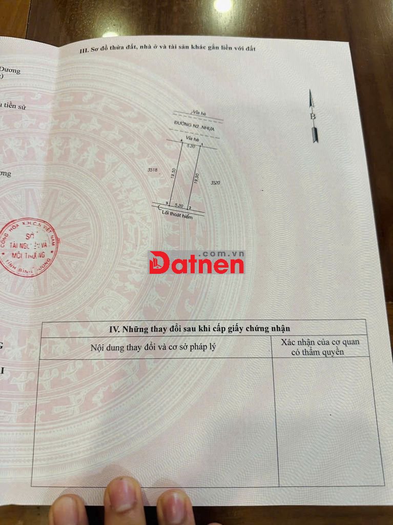 - Dt: 101,4m2 ngang 5,2m, dài 19,6m Full thổ cư - Hướng Bắc!