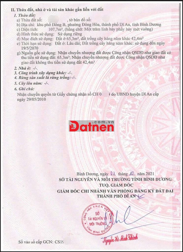 Đất 108m ngang 5.2m gần trường cấp 1.2.3 phường Đông Hòa Tp. Dĩ An