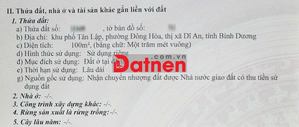 BÁN LÔ ĐẤT VÀNG 100m2 (5x20) TÂN LẬP - ĐÔNG HÒA - DĨ AN