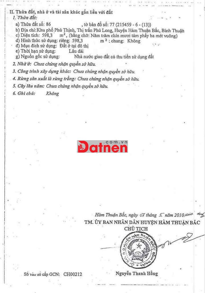 Quý vị đang xem nội dung tin rao "Bán đất full thổ cư, 598m2 tại Phú Long, Hàm Thuận Bắc". Mọi thông tin, nội dung liên quan tới tin rao này là do người đăng tin đăng tải và chịu trách nhiệm. Datnet.com.vn luôn cố gắng để các thông tin được hữu ích nhất cho quý vị tuy nhiên Datnet.com.vn không đảm bảo và không chịu trách nhiệm về bất kỳ thông tin, nội dung nào liên quan tới tin rao này.