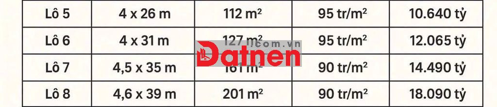 💎Lô số 5&6 : 8 x 26 nở hậu (239 m2 ) giá 95 tr/m2