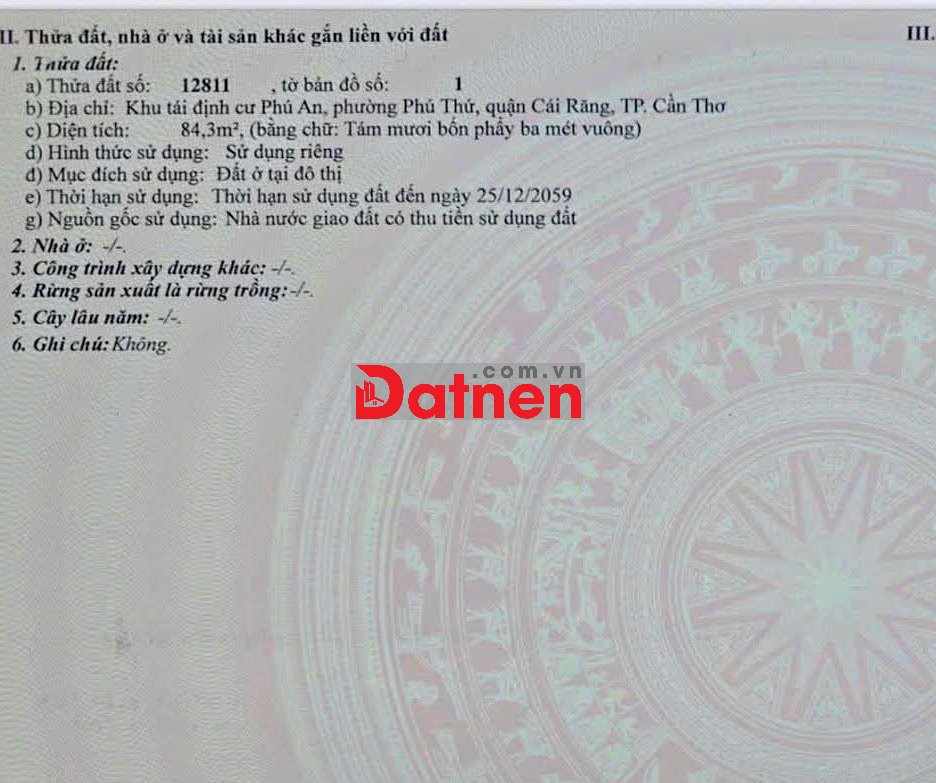 Quý vị đang xem nội dung tin rao "BÁN NỀN GIÁ TỐT 84,3M² ĐƯỜNG C4 KDC PHÚ AN, SỔ HỒNG, GIÁ 2TY400". Mọi thông tin, nội dung liên quan tới tin rao này là do người đăng tin đăng tải và chịu trách nhiệm. Datnet.com.vn luôn cố gắng để các thông tin được hữu ích nhất cho quý vị tuy nhiên Datnet.com.vn không đảm bảo và không chịu trách nhiệm về bất kỳ thông tin, nội dung nào liên quan tới tin rao này.