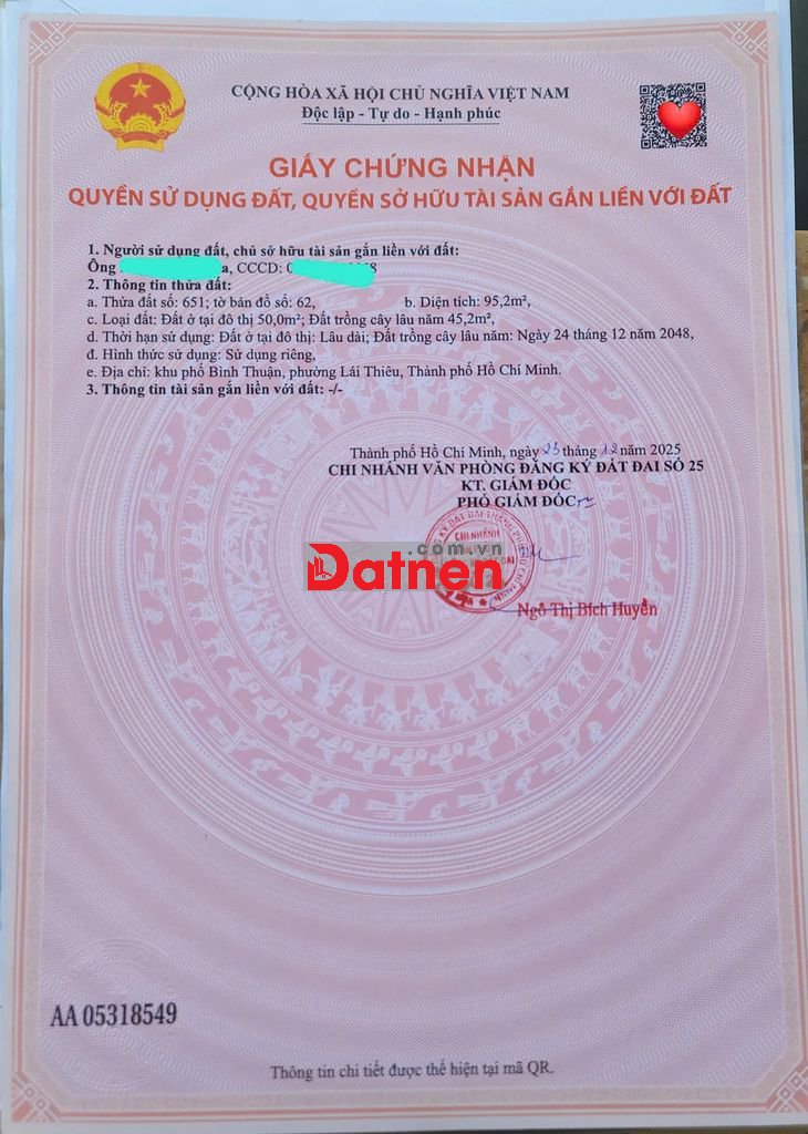Do cần tiền đi Iran định cư nên mình cần bán lô đất mặt tiền đường Bình Nhâm 07, khu vực dân cư hiện hữu, thuận tiện sinh sống và đầu tư.
