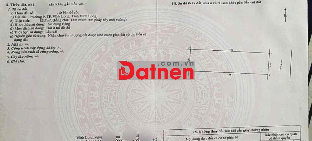 - DT: 85,7m2 (5x17m) thổ cư