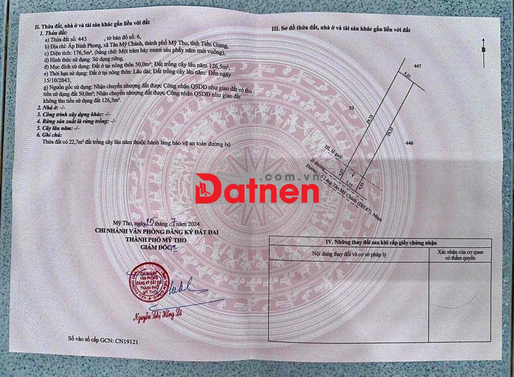 Đất bán 5.25m x 34m,có 50m thổ cư ĐH87, xã Mỹ Phong.
