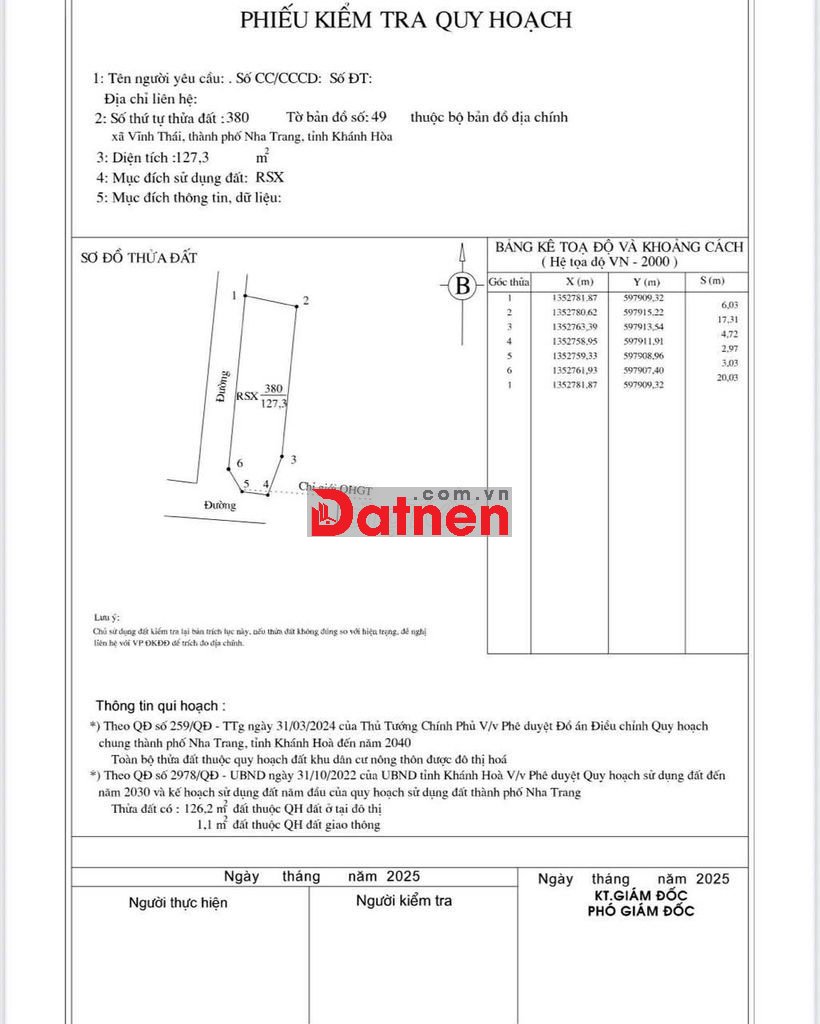 Bán 127 m2 đất KHÔNG NGẬP LỤT tại Đất Lành, Vĩnh Thái, Nam NT, 2,5 tỷ.