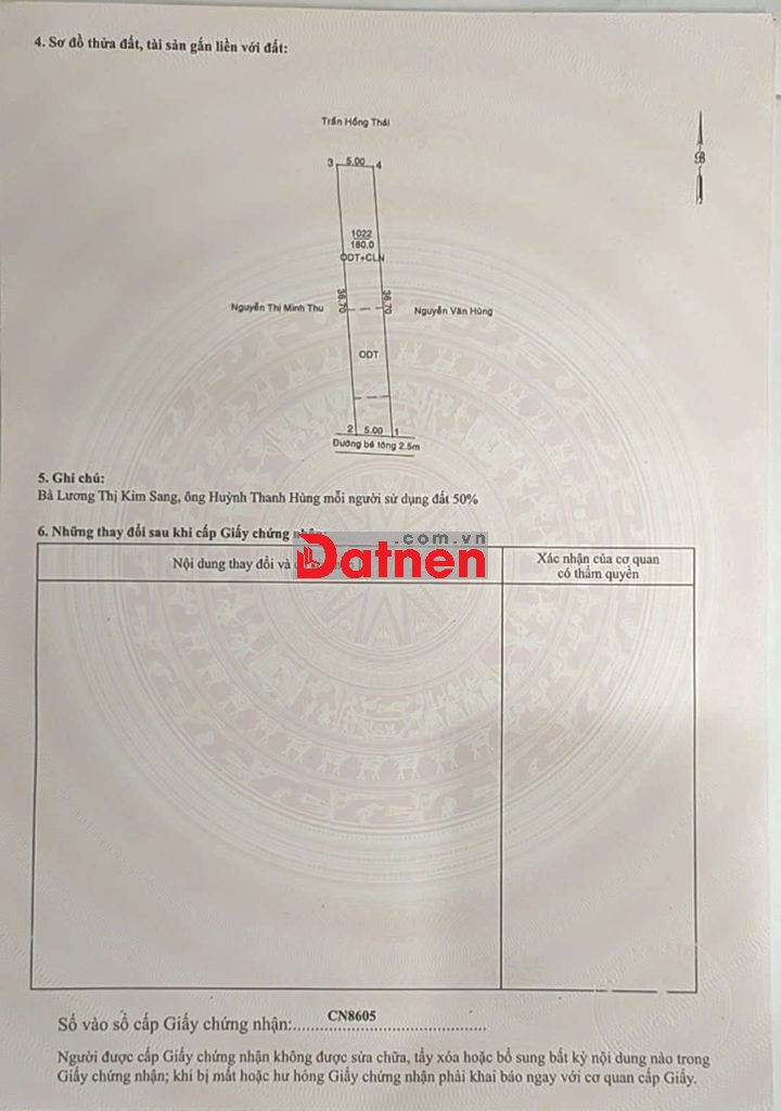 - Đất thổ cư, dt 180m2, ngang 5m, hẻm xe hơi, đường hẻm thông 2 đầu.