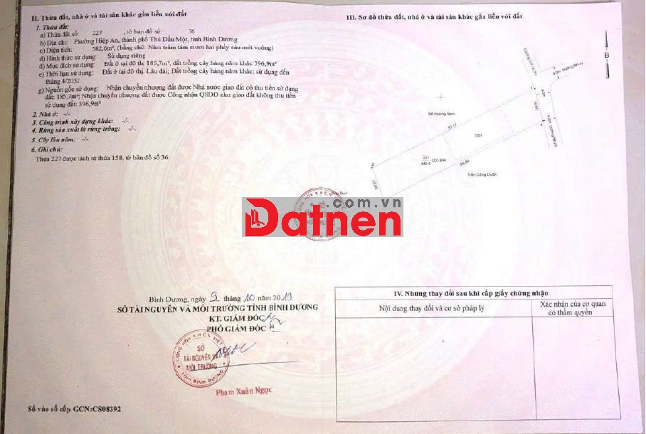 - Mục đích và thời hạn sử dụng đất: Đất ở tại đô thị 185,7m2 thời hạn sử dụng lâu dài, đất trồng cây hàng năm khác 396,9m2 thời hạn sử dụng đến tháng 4/2032