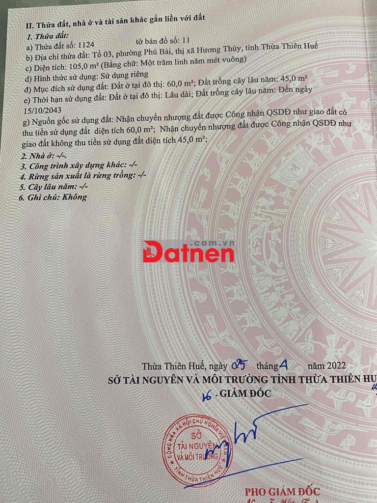 Đất ngay trung tâm Phú Bài. Cao ráo, không ngập lụt, gần chợ, bưu điện, trường học… thích hợp an cư , hay đầu tư sinh lời. Anh chị chạy quảng cáo làm ơn đừng gọi em. Cám ơn đã xem.