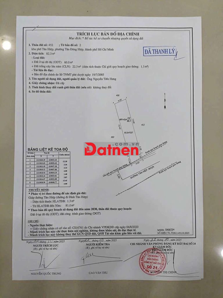 Quý vị đang xem nội dung tin rao "Bán đất mặt tiền đường Tân hiệp Tân Bình TP dĩ An Bình Dương". Mọi thông tin, nội dung liên quan tới tin rao này là do người đăng tin đăng tải và chịu trách nhiệm. Datnet.com.vn luôn cố gắng để các thông tin được hữu ích nhất cho quý vị tuy nhiên Datnet.com.vn không đảm bảo và không chịu trách nhiệm về bất kỳ thông tin, nội dung nào liên quan tới tin rao này.