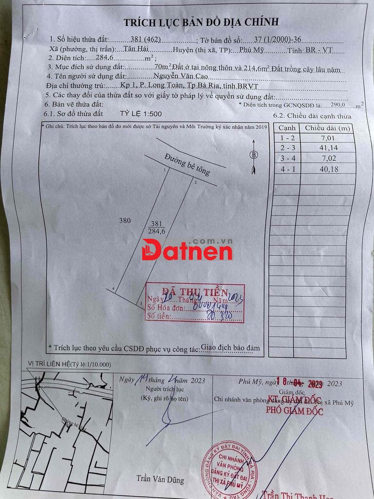 - Mình cần bán lô đất: 7x41m, diện tích thực tế: 284,6m2. 70m2 thổ cư