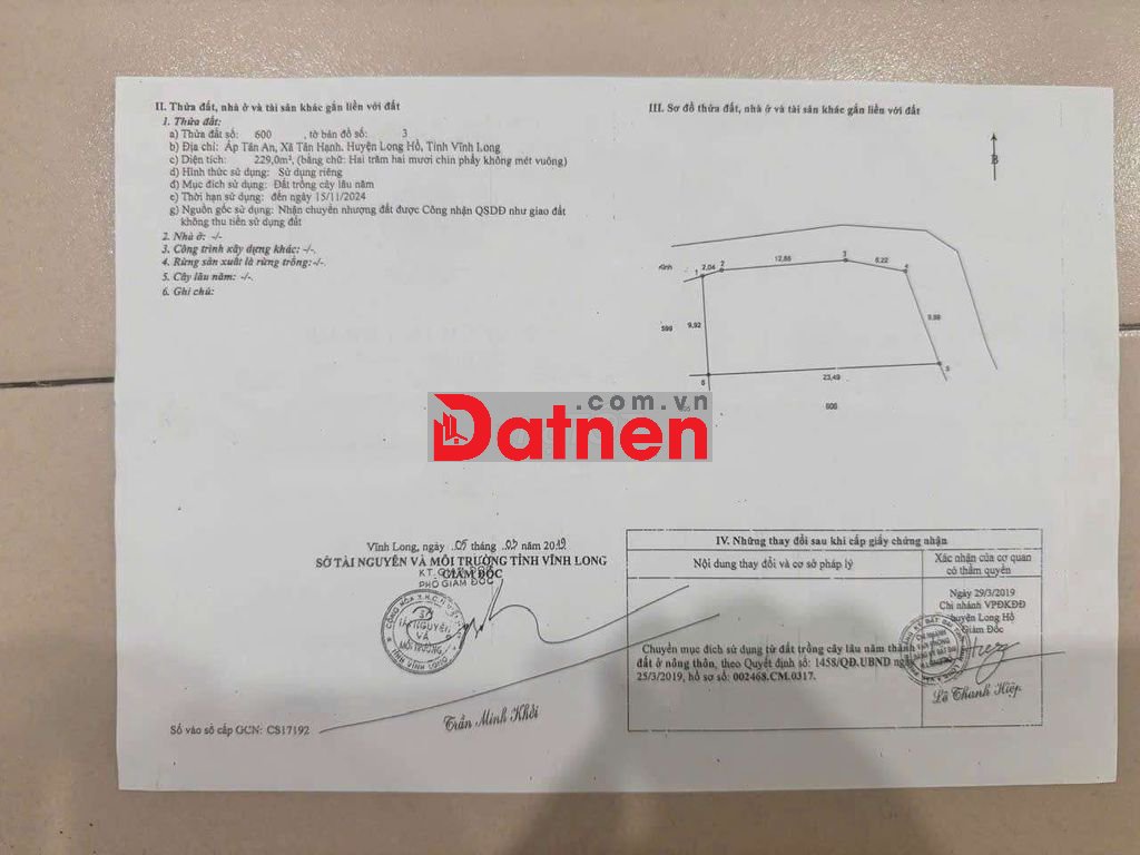 BÁN ĐẤT THỔ CƯ 229 m2 - GẦN QL53 – PHƯỜNG TÂN HẠNH, VĨNH LONG