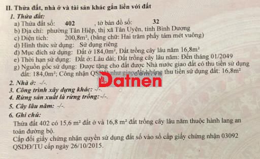 Đất Thổ Cư + 200,8m2 + TÂN HIỆP BÌNH DƯƠNG