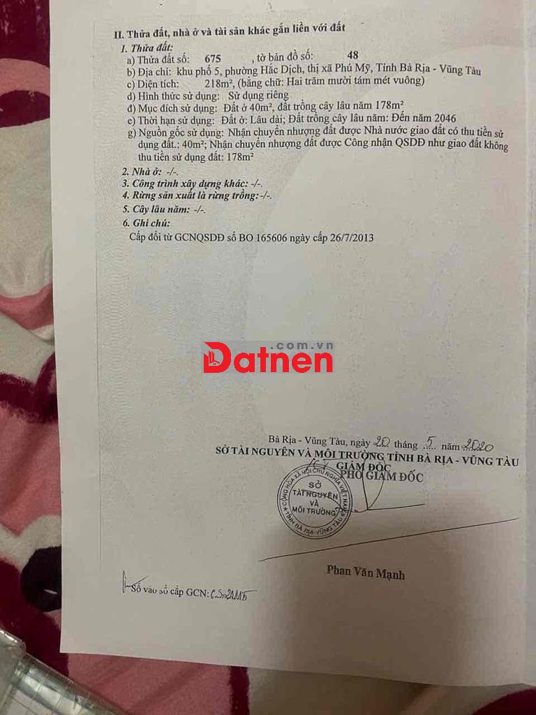 - Mặt tiền đường nhựa rộng 8 mét thuộc khu phố 5, Hắc Dịch, Phú Mỹ ( nay là phường Tân Thành, TPHCM ).