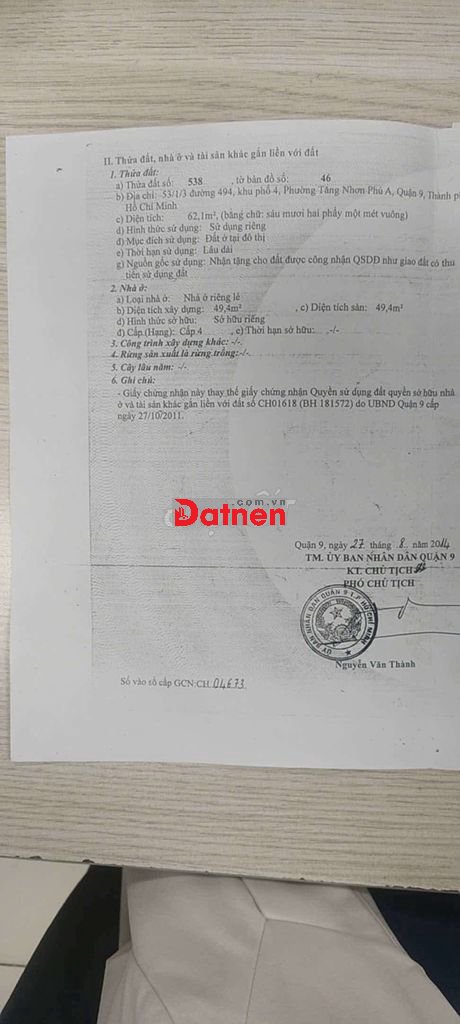Chủ gưi Bán lô đất đường 494 Phường Tăng Nhơn Phú A, Quận 9.