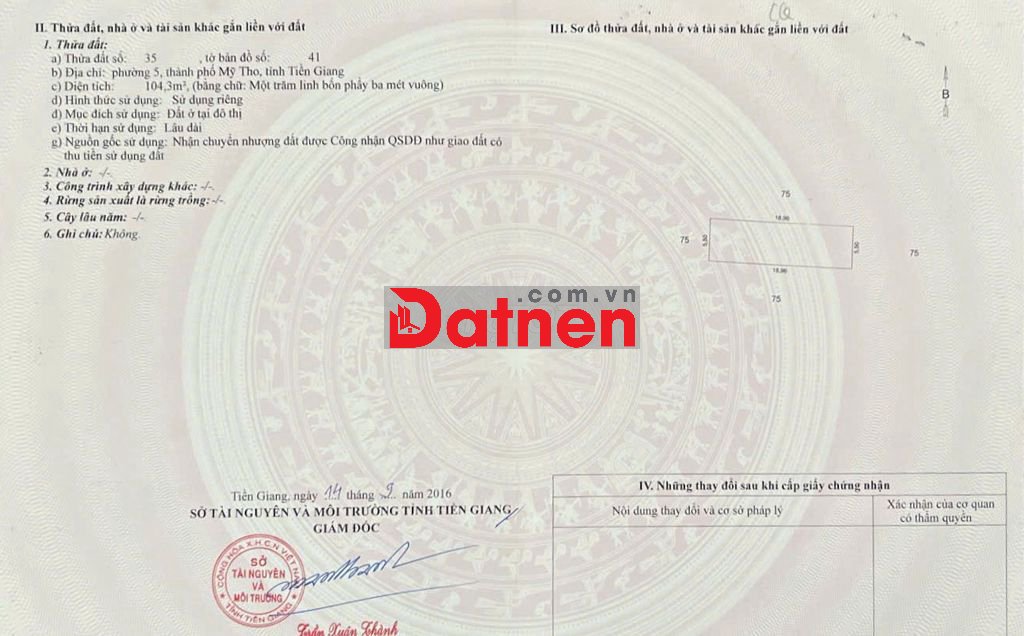 5,7m x 41,2m hướng Tây, có 104,3m² thổ cư.
