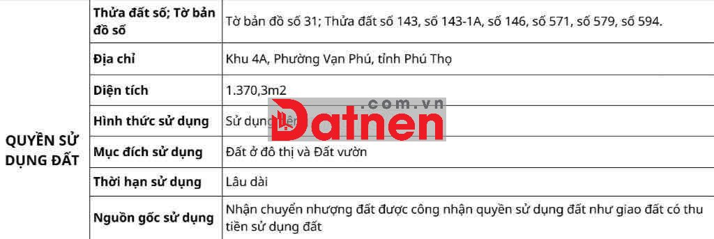 Quý vị đang xem nội dung tin rao "Chuyển nhượng 1370m2 mặt đường thành phố Việt Trì". Mọi thông tin, nội dung liên quan tới tin rao này là do người đăng tin đăng tải và chịu trách nhiệm. Datnet.com.vn luôn cố gắng để các thông tin được hữu ích nhất cho quý vị tuy nhiên Datnet.com.vn không đảm bảo và không chịu trách nhiệm về bất kỳ thông tin, nội dung nào liên quan tới tin rao này.