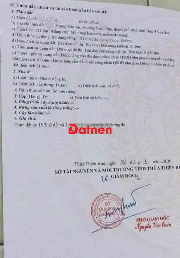 ĐẤT MẶT TIỀN DƯƠNG VĂN AN, Xuân Phú Tp Huế 121m2 za 3,x tỷ gần Uỷ Ban