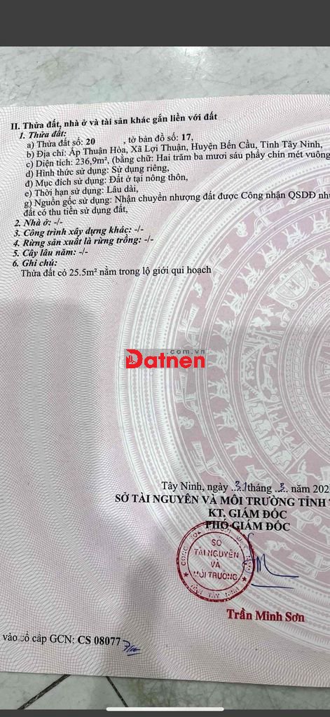 Quý vị đang xem nội dung tin rao "chính chủ Bán đất mặt tiền gần chợ xã lợi thuận bến cầu Tây Ninh". Mọi thông tin, nội dung liên quan tới tin rao này là do người đăng tin đăng tải và chịu trách nhiệm. Datnet.com.vn luôn cố gắng để các thông tin được hữu ích nhất cho quý vị tuy nhiên Datnet.com.vn không đảm bảo và không chịu trách nhiệm về bất kỳ thông tin, nội dung nào liên quan tới tin rao này.