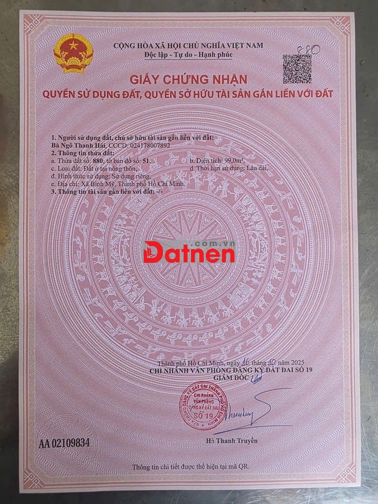 ĐẤT SỔ HỒNG RIÊNG ĐƯỜNG HÀ DUY PHIÊN, XÃ BÌNH MỸ, TP. HỒ CHÍ MINH