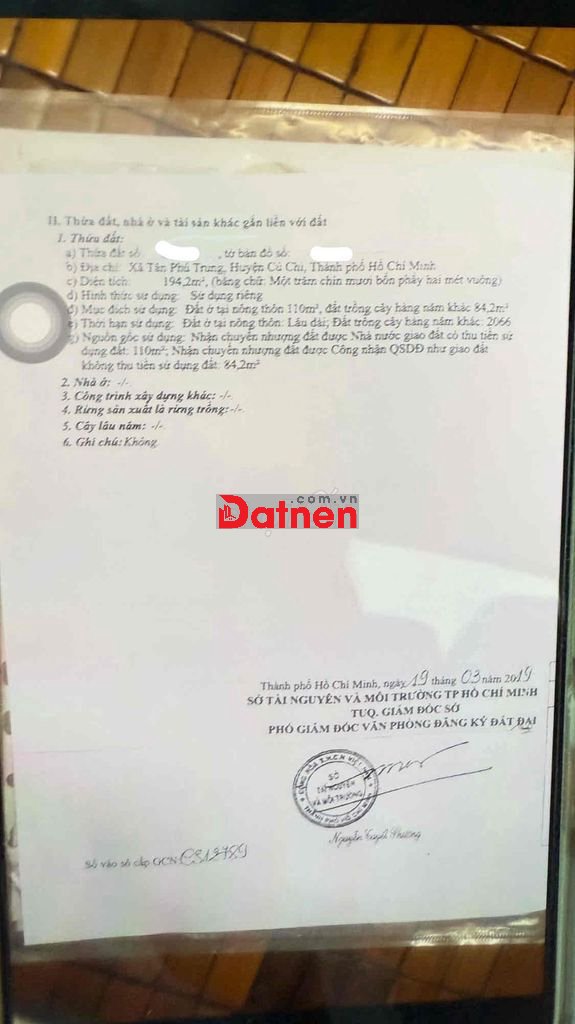 Chính chủ bán đất MT Củ Chi diện tích 194,2m2 (đất nông thôn 110m2, đất trồng cây hàng năm 84,2m2)