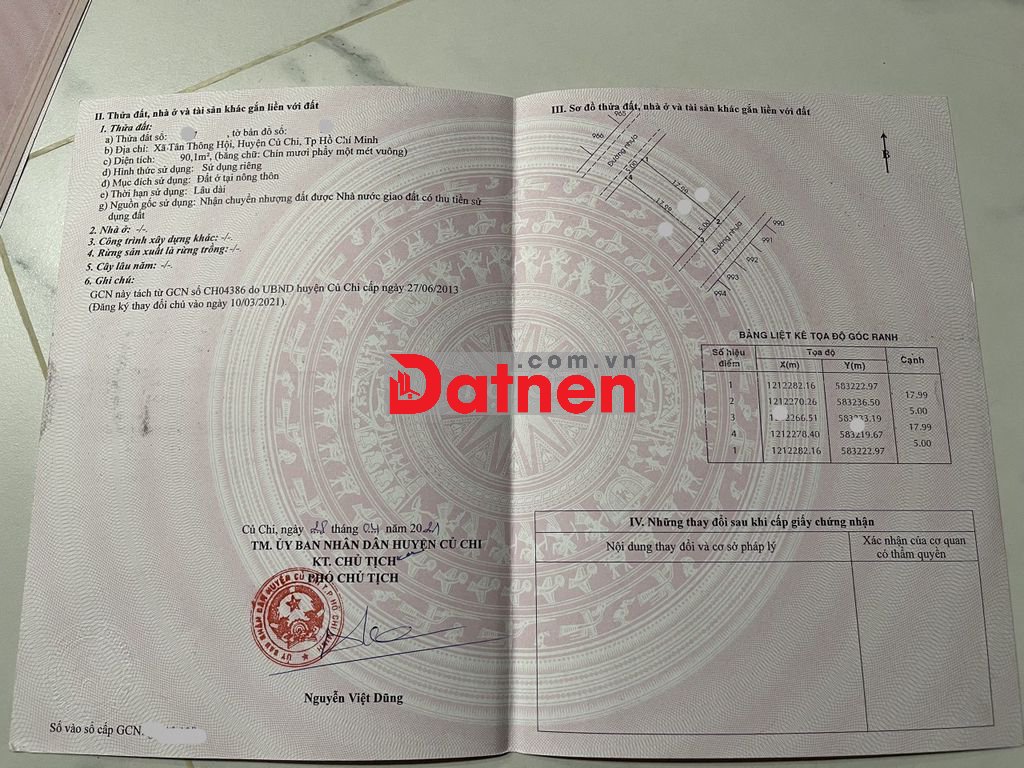 Diện tích 90m² (5x17m) thổ cư toàn bộ, đường nhựa lộ giới 12m ô tô tới tận đất.