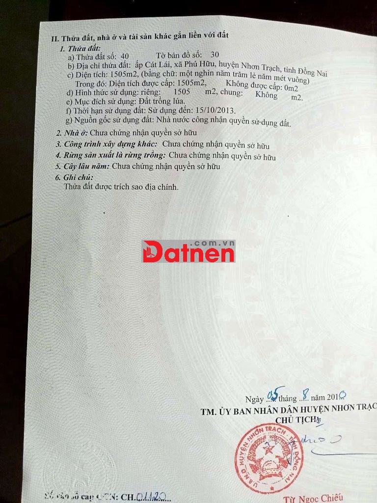 Cằn bán đất tại xã Phú Hữu Nhơn trạch Đồng nai cách phà cát lái 1km tổng diện tích 1505m giá bán 9 tỷ 3 liên hệ trực tiếp ***