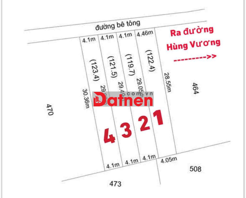 Đi từ đường Hùng Vương , lô đất bên tay trái ( có xây ranh gạch kế bên lô đất kg có xây ranh ). Lô số 2 ( theo bản vẽ ) : 4.1 m x 29 m , khoảng 119.7 m2