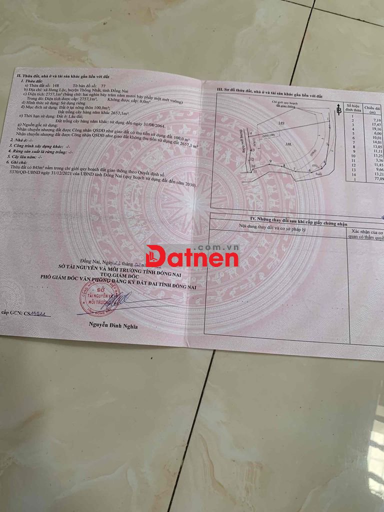 Đất lớn ( 2757m2) qui hoạch phủ hồng, có sẵn 100m2 thổ cư, khu dân cư , đa số làm biệt thự vườn.