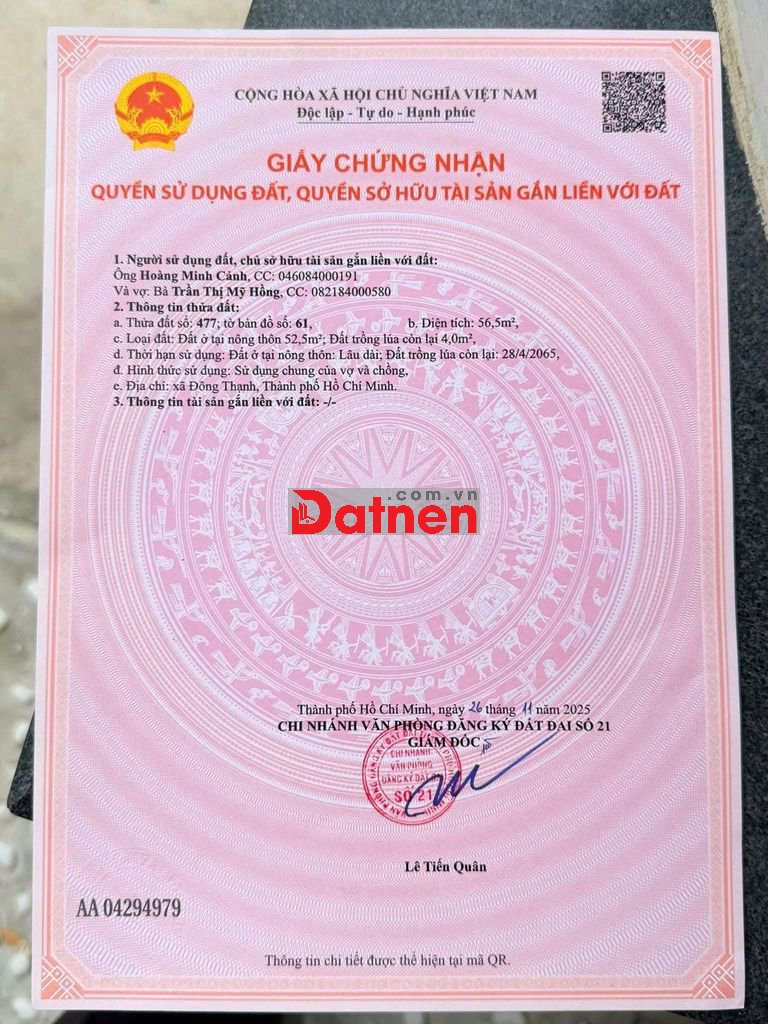 BÁN ĐẤT THỔ CƯ. DT: 4×17M. KHU DÂN CƯ