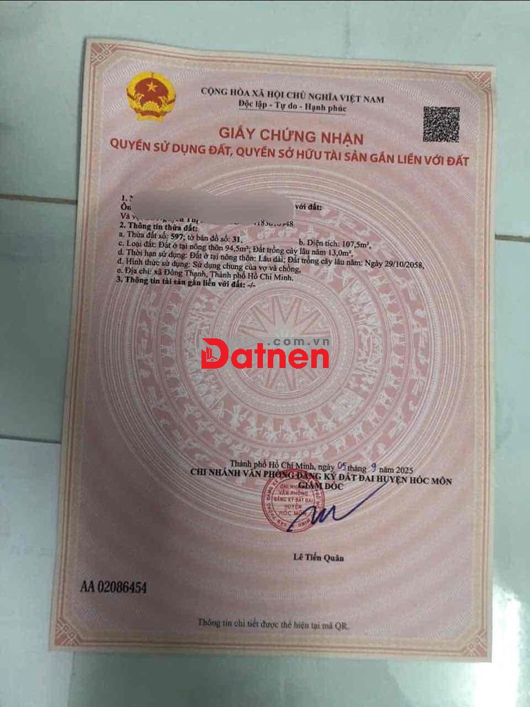 Đất Sổ Hồng riêng, mặt tiền Đông Thạnh giáp Đặng Thúc Vịnh huyện Hóc Môn, 105m chính chủ