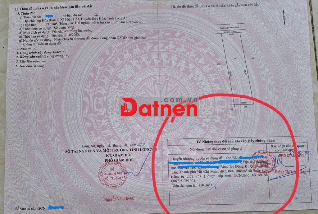 Bán Đất Ấp Hòa Bình 2, Xã Hiệp Hòa, Đức Hòa Long An (01 Sổ chính 1100m2, 01 Sổ chuyển thổ cư 300m2 )