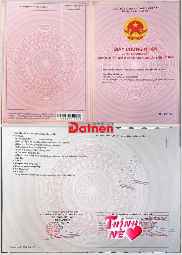 BÁN ĐẤT TẠI XÃ HỰU THẠNH, ĐỨC HÒA, LONG AN -100M2