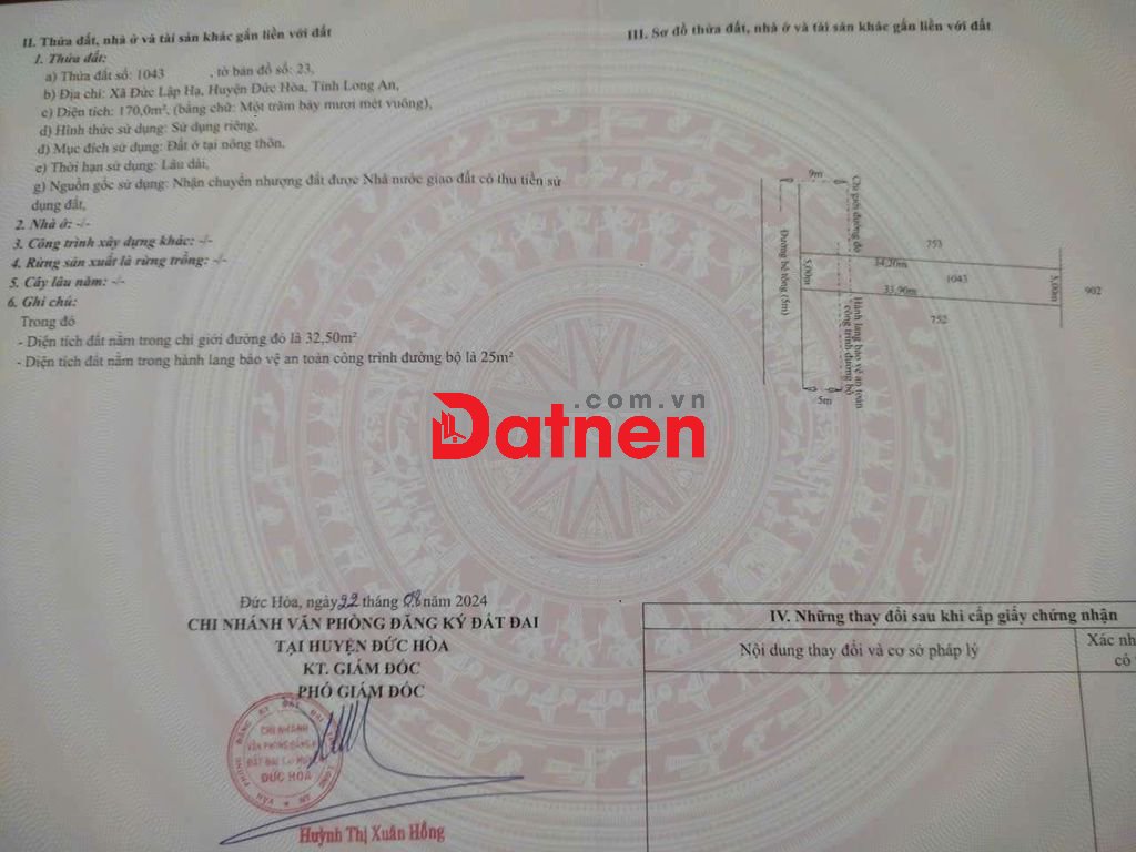 Đất sổ hồng, thổ cư 100%, đất hướng Tây thuộc xã Đức Lập Hạ- Đức Hoà- Long An. Hướng Bắc ra Mỹ Hạnh về Cầu Lớn Hóc Môn, Hướng Tây ra cầu vượt Củ Chi về thị trấn Củ Chi