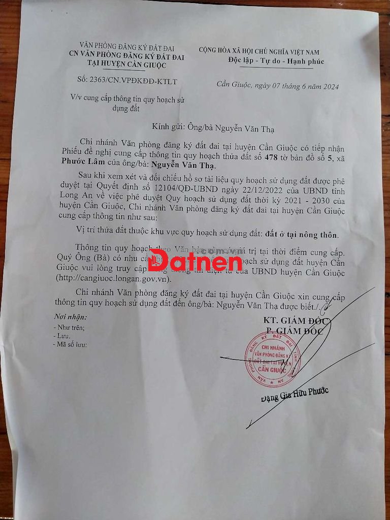 - Vị trí thửa Đất được quy hoạch: Đất ở tại nông thôn