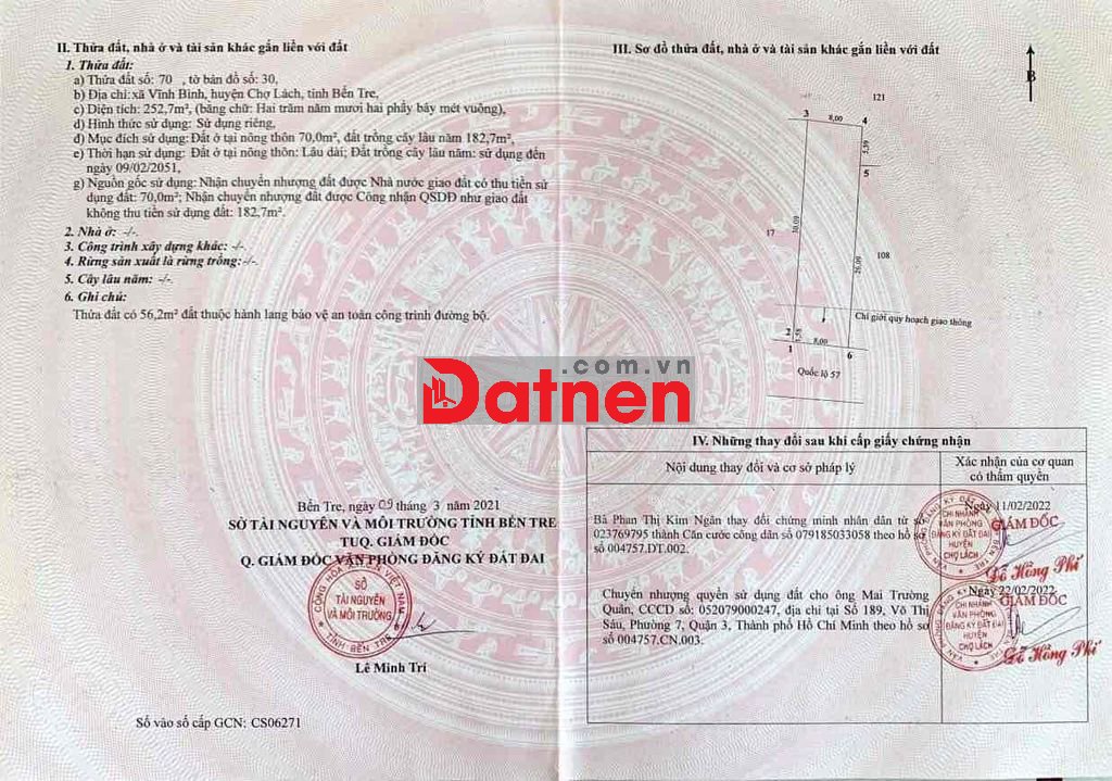 BÁN ĐẤT 3 MẶT TIỀN ĐUỜNG QUỐC LỘ 57 (Chuẩn bị làm đường mở rộng đuờng trục chính TP Vĩnh Long)