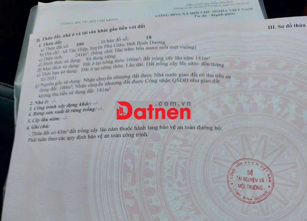 Cách Dht 507 = 15 m . Cách ubnd xã 1 km . Cách điện lực Phú giáo 5 km