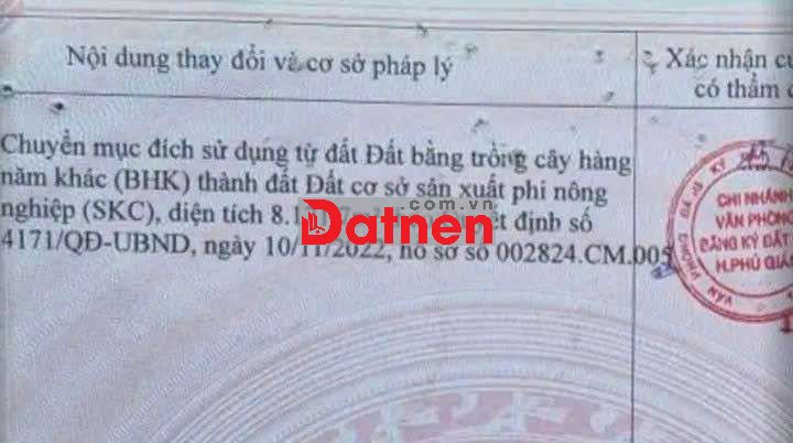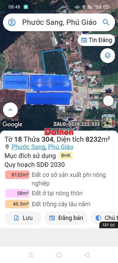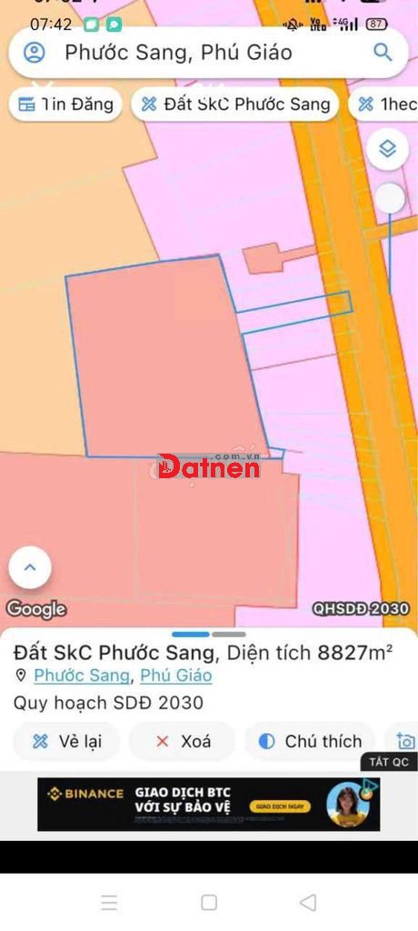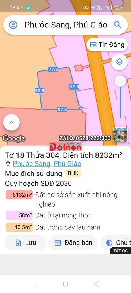 Đất SKC sản xuất kinh doanh đóng tiền 1 lần 30 năm. Đường nhựa ĐH-506 xã Phước Sang, Phú Giáo cũ. Tổng S 8.800m², full SKC, có 100m thổ cư, xung quanh nhiều nhà Xưởng lớn. Giá bán rẻ 21,5 tỷ đồng..