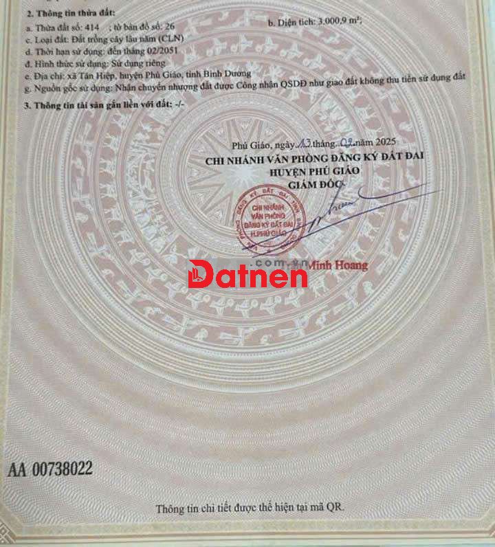 Bán đất Sào giá rẻ S : 30m x 100m = 3.000m². đường nhựa ĐH-511 xã Tân Hiệp Phú Giáo. Cách 3fa chỉ 200m. Thuận tiện chuyển đổi qua SKC làm kho Xưởng. Hoặc chuyển thổ cư xây biệt thự nhà vườn. Thông ra TTHC huyện Phú Giáo. Giá bán ngợp 116 triệu/mét ngang. Còn rẻ hơn giá đất nền khu vực hiện tại...