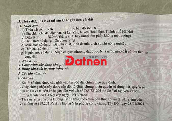 Quý vị đang xem nội dung tin rao "đất thổ cư S 78m2 đã có sổ khu dịch vụ Lại Yên". Mọi thông tin, nội dung liên quan tới tin rao này là do người đăng tin đăng tải và chịu trách nhiệm. Datnet.com.vn luôn cố gắng để các thông tin được hữu ích nhất cho quý vị tuy nhiên Datnet.com.vn không đảm bảo và không chịu trách nhiệm về bất kỳ thông tin, nội dung nào liên quan tới tin rao này.