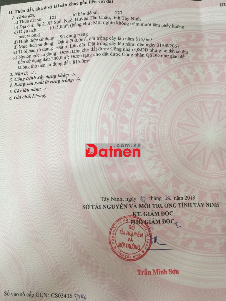 Cần bán đất 1015m2 (200 m2 thổ cư), ngang 20m dài 50m, trung tâm xã Suối Ngô, huyện Tân Châu, tỉnh Tây Ninh, vị trí mặt tiền đường bê tông 6m, trung tâm xã suối Ngô. Phù hợp mua xây biệt thự, nhà xưởng, quán coffee sân vườn, mua đầu tư. Giá bán 3 tỷ (TL)