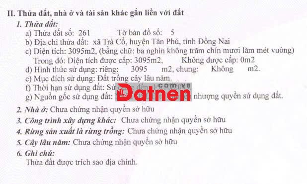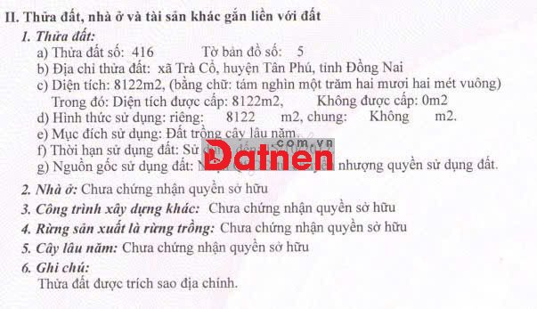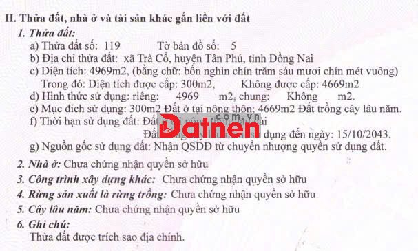 * Đất trồng cây lây năm 16.186m2 (3 sổ liền kề), trong đó có 300m2 thổ cư có nhà cấp 4 trên đất. Tại xã Tân Phú (xã Trà Cổ, H Tân Phú cũ), T Đồng Nai. Đất đang trồng 2.500 cây sưa đỏ, cây trồng từ năm 2010, Sổ hồng đầy đủ.