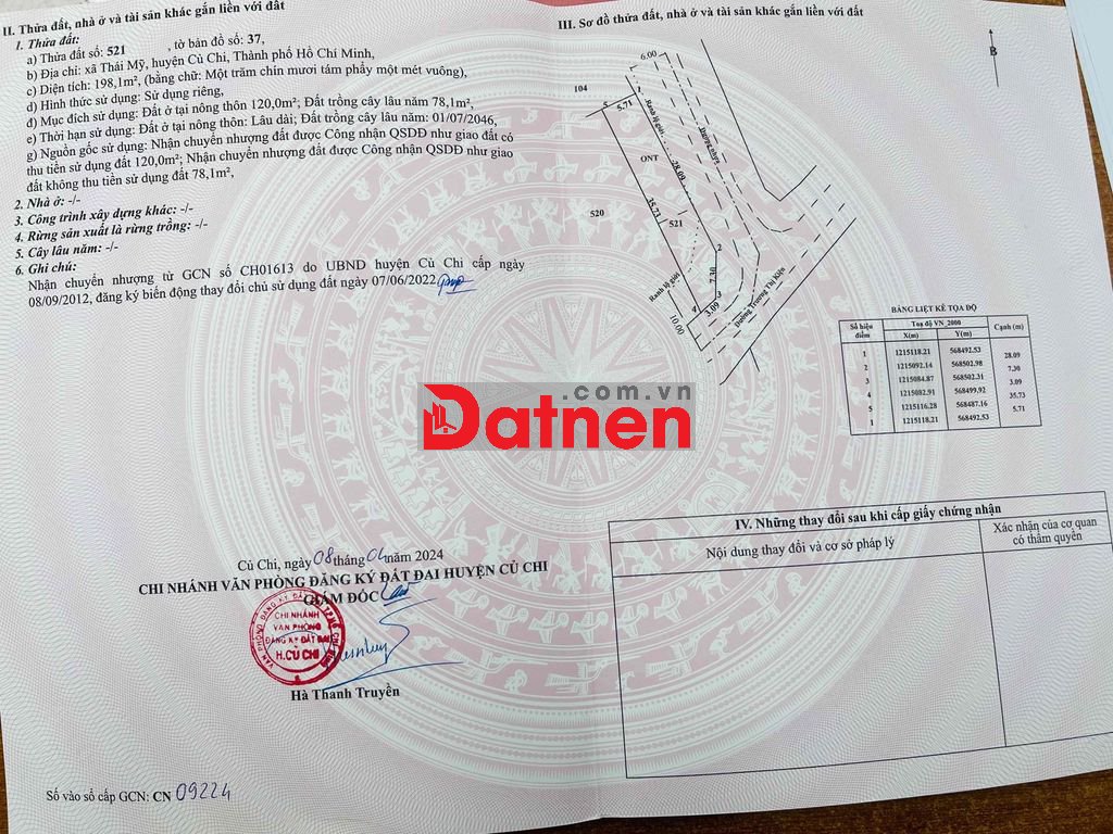 Diện tích sổ 198,1m², đất vuông vức.