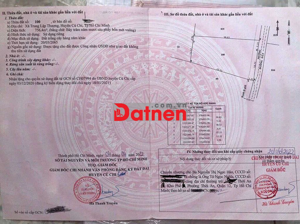 Tổng diện tích 756 m đất là đất vườn ,có tên đường, đường là 12 m xe 7 chỗ đến đất, đường là đường thông hợp tác với dịch vụ bán nhanh ,hỗ trợ vay ngân hàng chính chủ cần bán gấp,