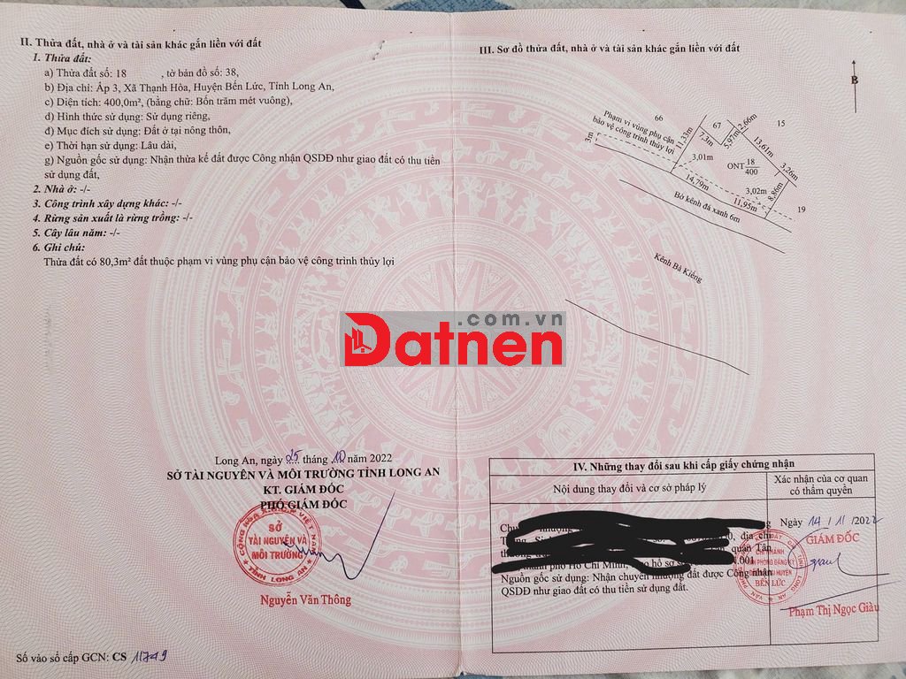 Đất 400 m2 thổ cư, mặt tiền kênh Bà Kiểng, xe oto vào tận nơi, cách đường DT816 một đường thẳng khoảng 500m, cách sông Vàm Cỏ Đông 50m. Khi hậu xung quanh thoáng mát tiện ở hoặc xây nhà nghỉ dưỡng.